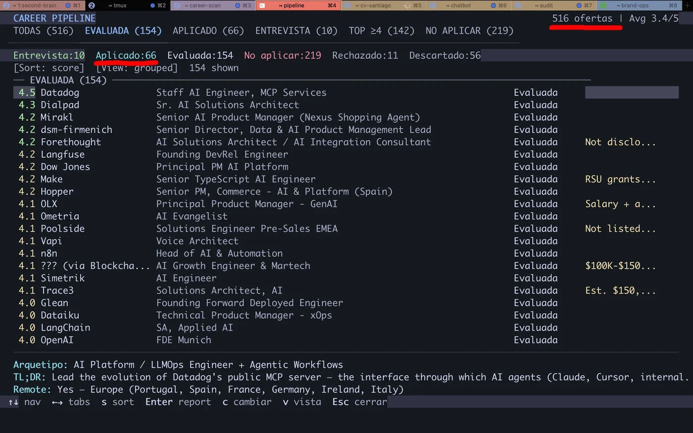 Career-Ops automatiza el análisis, no la decisión. Leo cada report antes de aplicar. Reviso cada PDF antes de enviarlo. Es la misma filosofía que un CRM: el sistema organiza, yo decido.